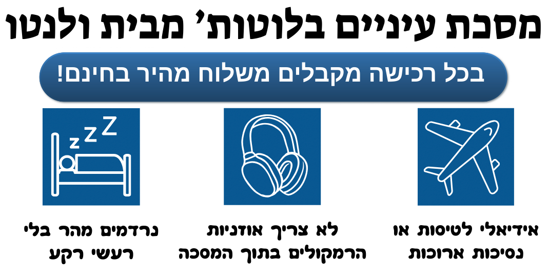 ה - NightMask™ חוסמת אור מלא ומשלבת צלילים מרגיעים ישירות מהטלפון - גם בנסיעות ארוכות גם בטיסות וגם בבית